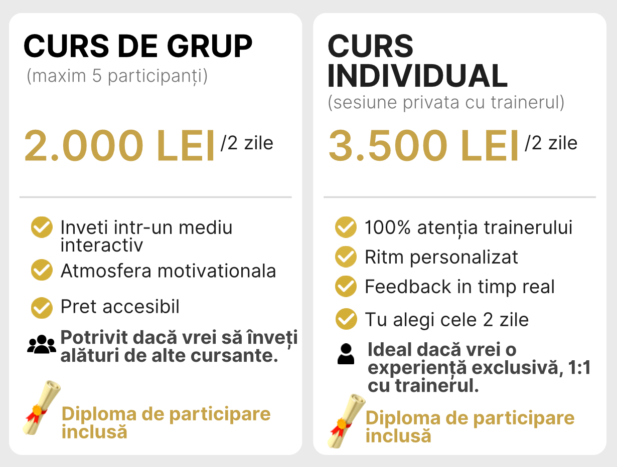 • 💳 Restul sumei, în prima zi de curs, înainte de începere.
